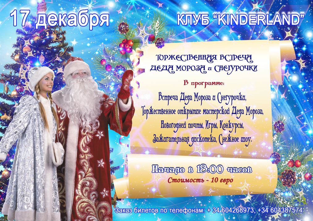 Дед Мороз и Снегурочка очень спешили поздравить детей из разных уголков Испании. В каждой школе выходного дня, в творческих коллективах при ассоциациях соотечественников, проживающих в Испании, были организованы Новогодние представления, спектакли, шоу, утренники.