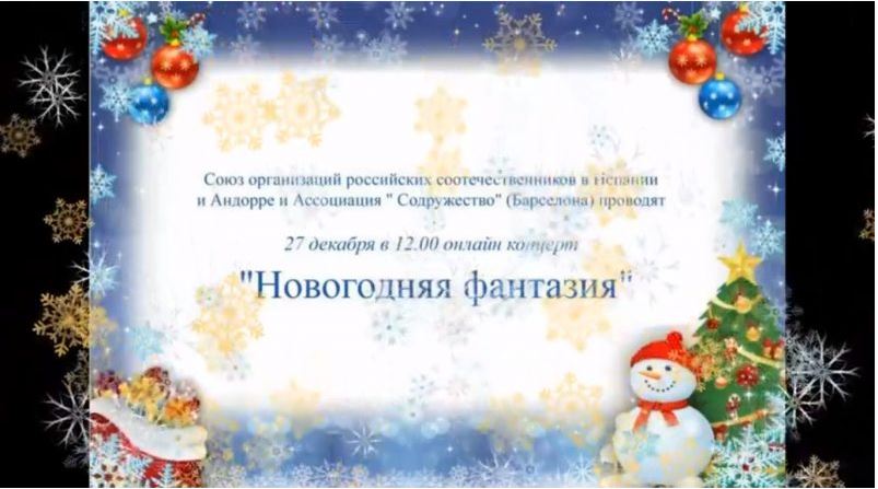 27 декабря в 12.00 на платформе zoom состоялся онлайн концерт молодых талантливых артистов из русских школ и Ассоциаций Испании и Андорры. В концерте участвовали коллективы и солисты из Барселоны, Лериды, Андорры, Тенерифе, Виго, Аликанте, Марбельи, Дении, Сан-Хуана, Торревьехи и т.д. Благодарим всех руководителей Ассоциаций и школ за подготовленные видео и концертные номера. Видео концерта смотрите далее...