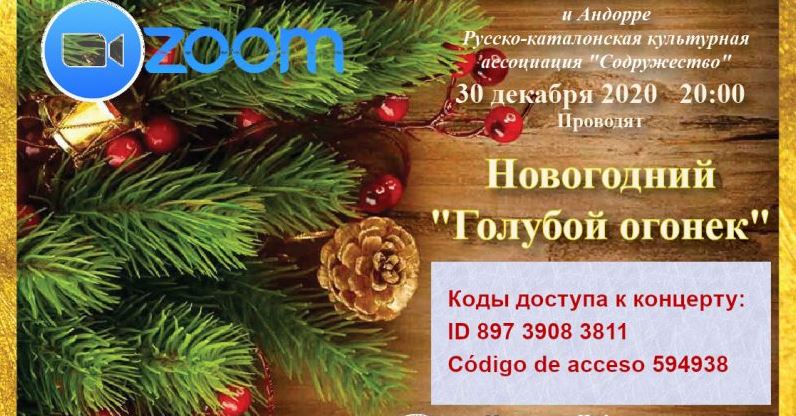 Сегодня, 30 декабря в 20.00 состоится трансляция по программе zoom Новогоднего Голубого огонька с участием профессиональных и самодеятельные артистов русскоязычных ассоциаций Испании и Андорры. Приглашаем присоединиться к нашему празднику.