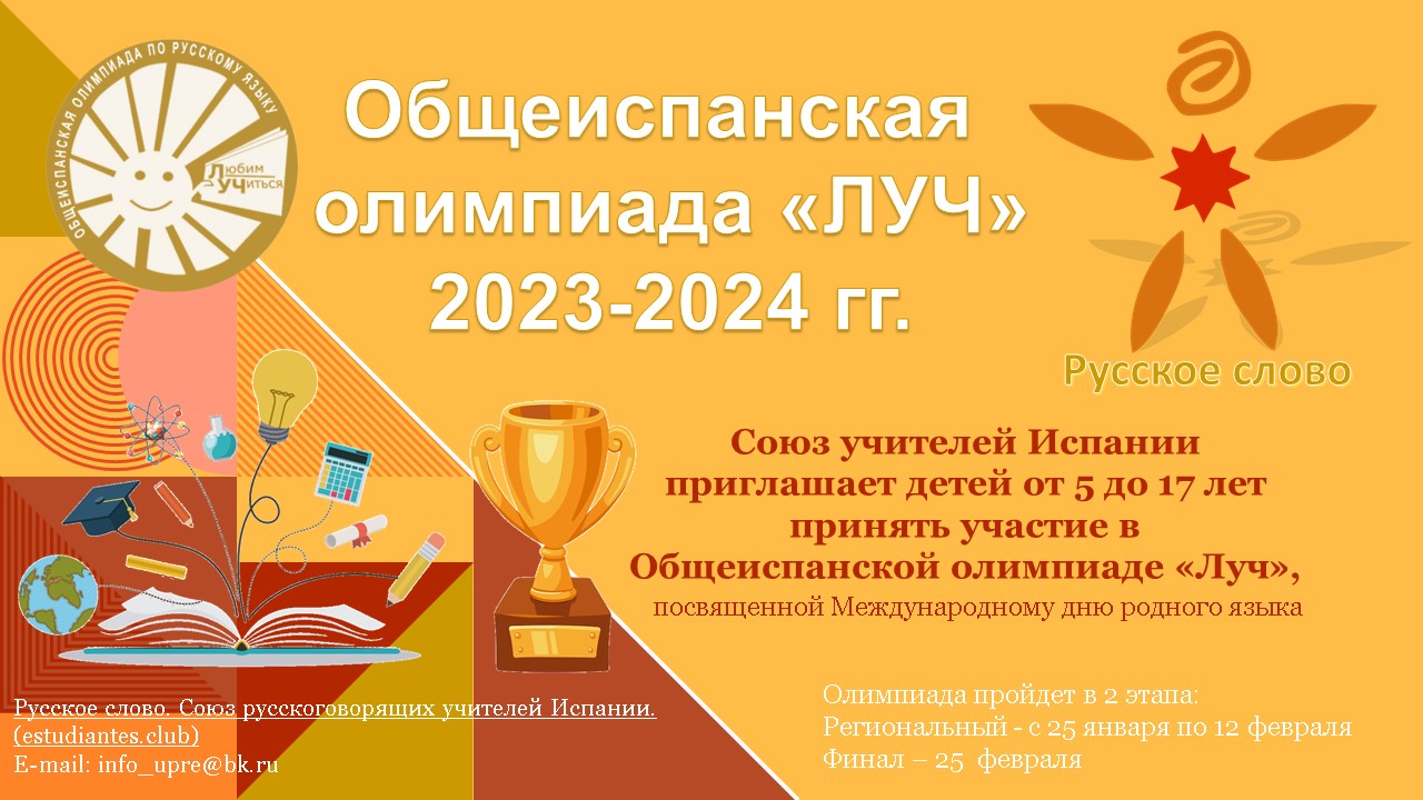 XII Общеиспанская олимпиада "Луч" приглашает слушателей курсов, школ и центров русского языка от 5 до 17 лет к участию. Олимпиада 2023-24 учебного года посвящена Международному дню родного языка и пройдет в 2 этапа.